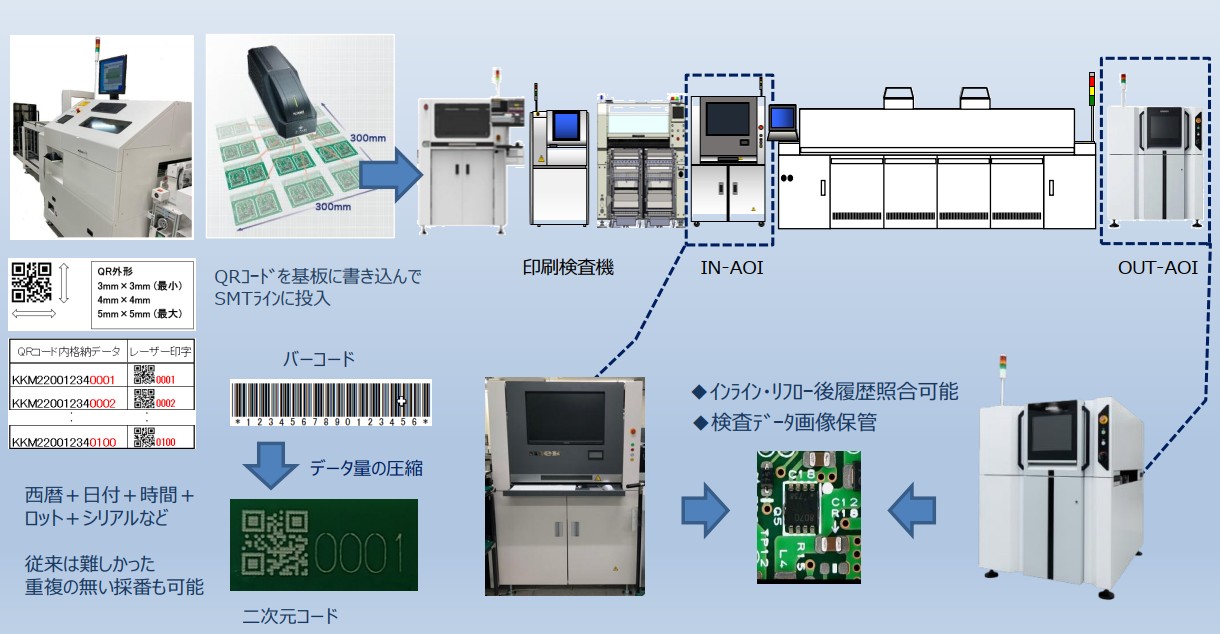 - 生基板1シート毎の二次元コード直接印字・付与により、部品ロット並びに各工程の製造情報(生産履歴、修理履歴、作業者情報等)が記録され、トレーサビリティ管理されます